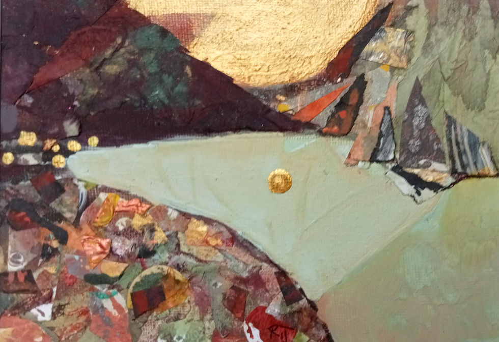 Mixed media collage material includes hand made and hand painted papers, craft tissue, metal, glass, oil paint, water based and acrylic paint, inks, fabrics, brocade, feathers and found natural objects (stone, bark, leaves, bone, shell)